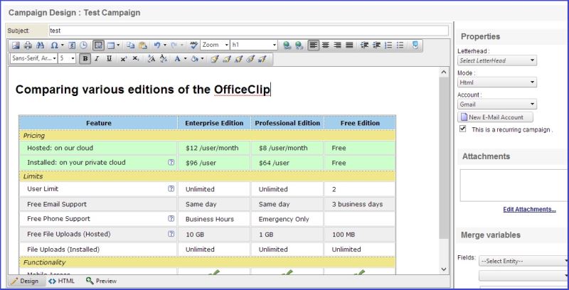 OfficeClip CRM provides a campaign designer that allows you to design your campaigns in WYSIWYG format and lets you include images and other media. It also provides a way to include campaigns designed using Microsoft Word.