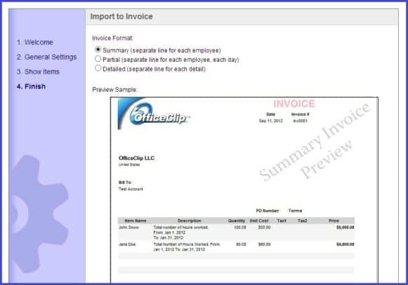 The billing wizard allows user to select accounts, users and date. It then gives the user ability to select how much detail they want their invoice to be presented.